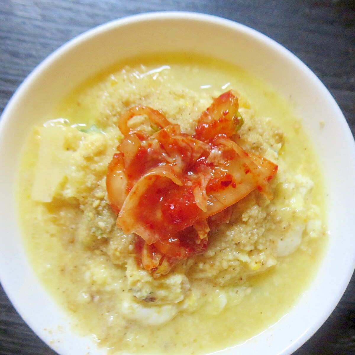 味噌汁で作る温泉卵のせキムチ雑炊 レシピ 作り方 By リスうなぎ クックパッド