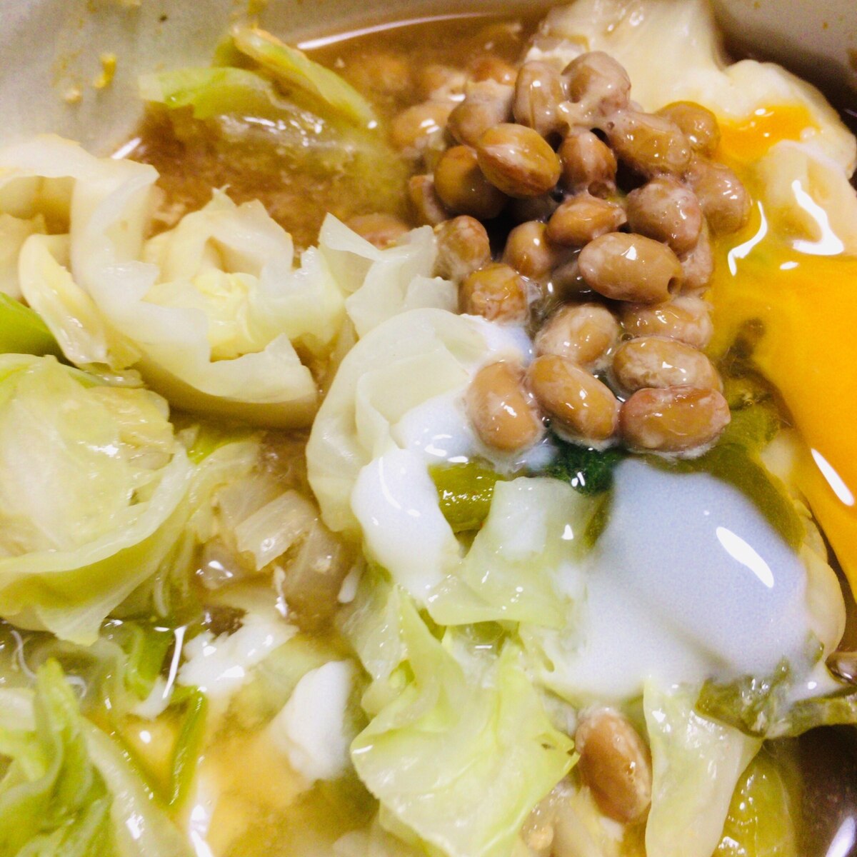 朝食 爆弾丼 卵 納豆 キムチ 韓国海苔 もやし ほうれん草 三つ葉 中華風あんかけ チンゲン菜 豚肉 玉葱 Flickr